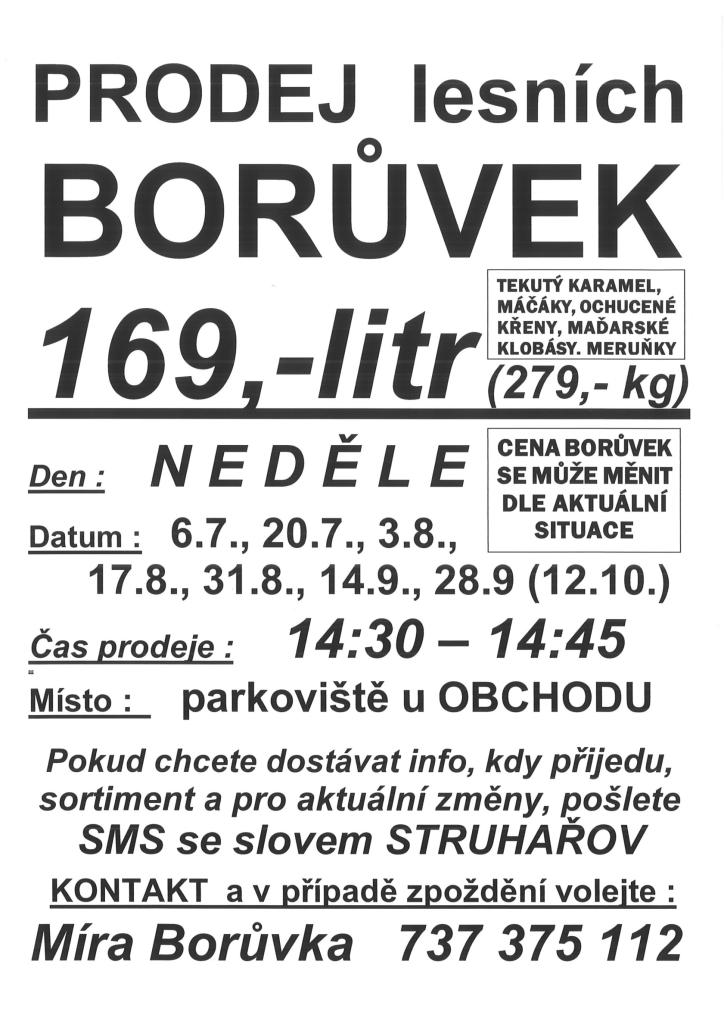 V naší obci bude opět probíhat prodej lesních borůvek, který se uskuteční na parkovišti u obchodu v čase 14:30 - 14:45. Přijďte si pro čerstvé plody v termínech: 6.7./20.7./3.8./17.8./31.8./14.9./28.9.