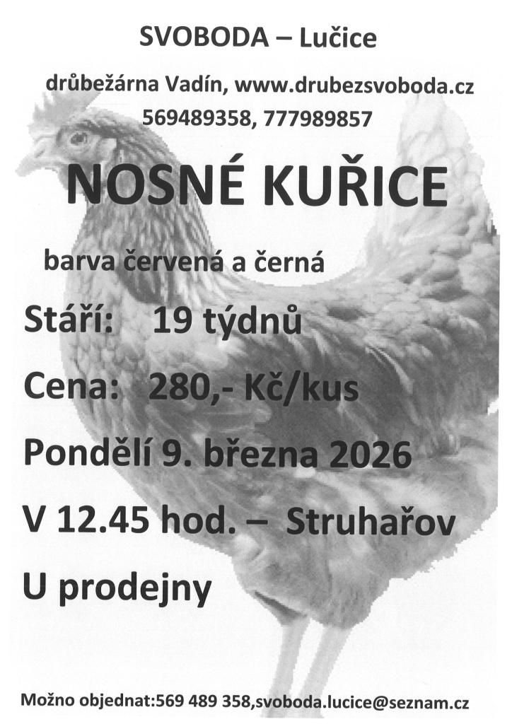 Lučice drůbežárna Vadín nabízí k prodeji nosné kuřice červené a černé barvy. Kuřice jsou ve stáří 19 týdnů a cena za kus je 280 Kč. Pro zájemce je možné objednat kuřice telefonicky nebo e-mailem/ 569 489 358, svoboda.lucice@seznam.cz/. Prodej se uskuteční v pondělí 9. března 2026 v 12:45 hodin u prodejny ve Struhařově. Neváhejte a využijte této příležitosti k zakoupení kvalitních nosných kuřic.